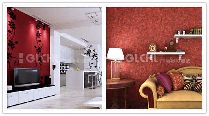 一、紅色是最搶眼的顏色,與在視覺上起收縮效果的藍色相比,紅色對視覺起強烈的沖擊作用。所以使用上,一定要注意緩和壓迫感,在使用量上要控制在總量的2成左右,或者不用鮮亮的紅色,而改用灰色調或暗色調的紅色,廣麗建議盡量將有強烈視覺沖擊的顏色用在局部裝飾中,例如背景墻的裝飾,可使用廣麗森特壁材系列藝術涂料與這類顏色進行搭配,即體現質感,又能讓房間墻面產生亮點。